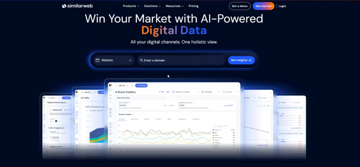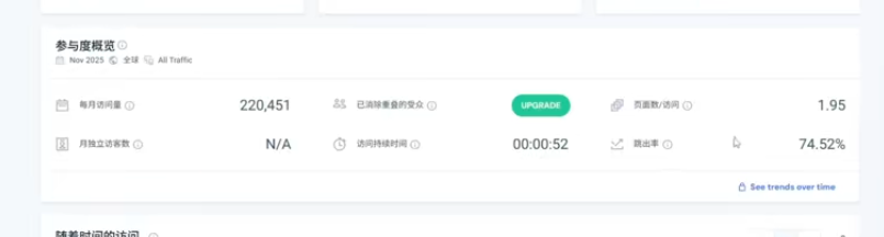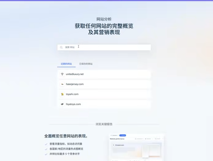 SimilarWeb 是一款用於分析獨立站資料的工具,核心功能包括分析競品獨立站的流量資料、流量來源、流量組成,以及尋找相似網站。