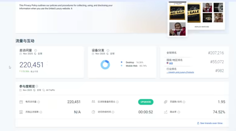 地理分佈: 顯示網站主要營運國家,如範例網站主要營運國家為美國,且流量呈上升趨勢。